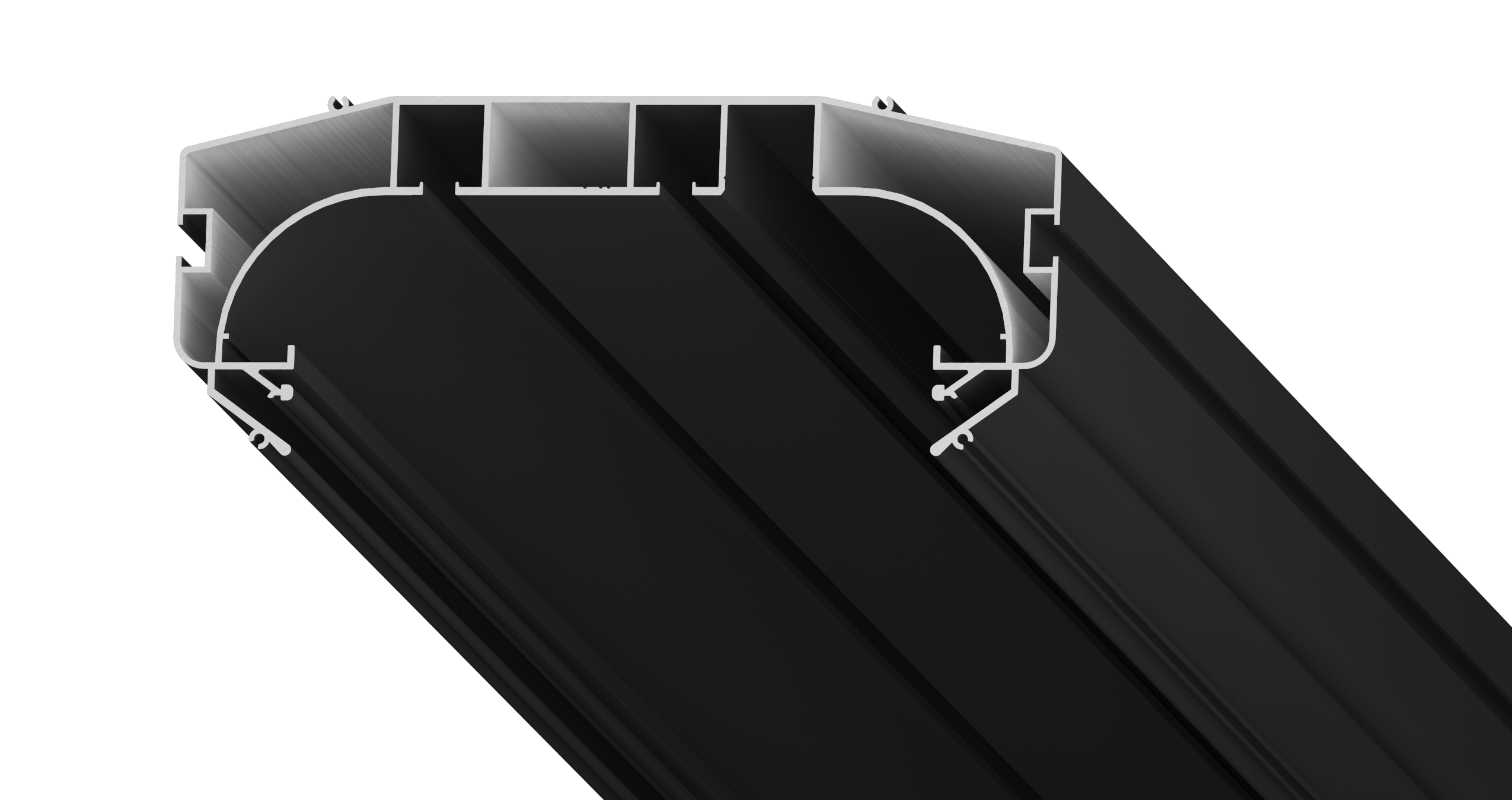 Разновидность дизайнерского карниза. Он представляет собой цельнометаллический профиль белого или черного цвета с двумя рядами для крепления крючков. Обладает увеличенным размером между рядами для крепления штор. Карниз имеет оптимальную ширину, для того чтобы складки на шторах формировались правильно. Возможна установка светодиодной ленты для подсветки штор. Конструкция профиля предусматривает фиксацию полотна при помощи гарпунной системы крепления. Паз для фиксации гарпуна закрывается маскирующей вставкой, алюминиевой или ПВХ. Оптимальное решение для оформления оконного пространства в любом помещении.