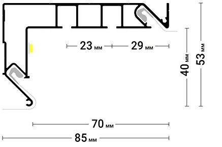 Профиль монтируется на стену, образуя скрытую нишу для установки карниза, что позволяет создать эффект невидимой крепежной системы , а также имеет различные размеры, что позволяет создавать карнизные ниши для штор и гардин разных длин и типов.