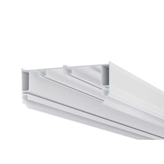 Карниз имеет горизонтальное расположение LED-ленты, свет направлен вертикально вдоль шторы. С помощью установки светорассеивателя, световой поток становится более мягким и равномерным. Посадочное место для светодиодной ленты имеет широкий паз, который позволяет использовать различные типы лент, включая RGB-ленты, для создания различных сценариев световых эффектов. Эффективная теплоотдача профиля позволяет увеличить срок службы светодиодной ленты.