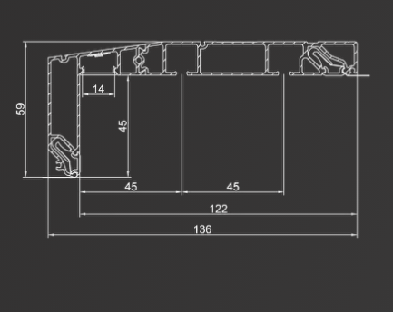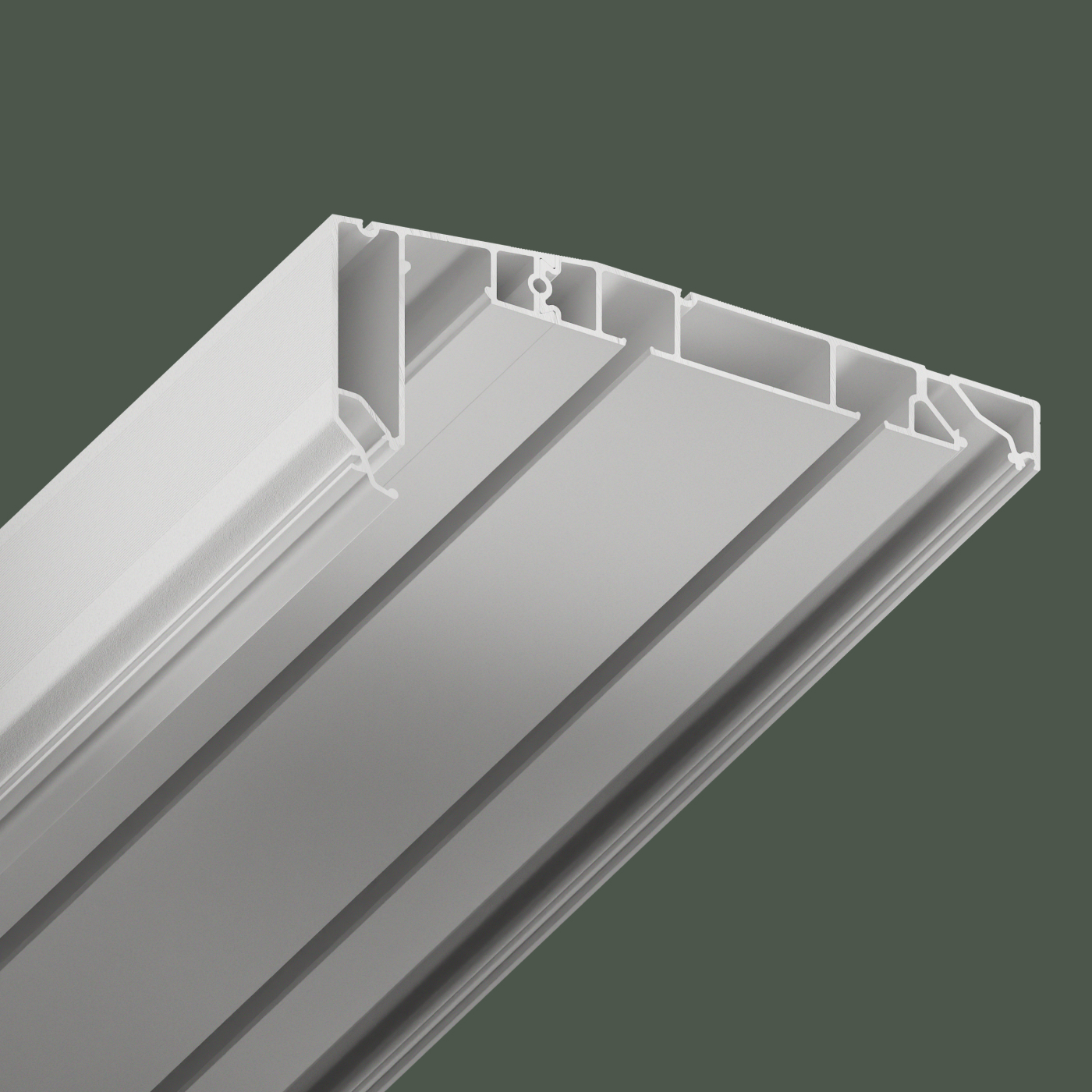 Профиль для изготовления скрытых карнизных ниш с двумя пазами под установку штор и тюля. Увеличенная глубина и расстояние между камерами 45 мм обеспечивают плавный и бесшумный ход бегунков. Пазы под гарпун закрываются PVC-вставкой.