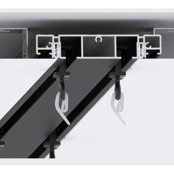 Важная особенность решения – наличие бесшумных прорезиненных бегунков белого или черного цвета. Система комплектуется демпфером для монтажа ПВХ и тканевых полотен.