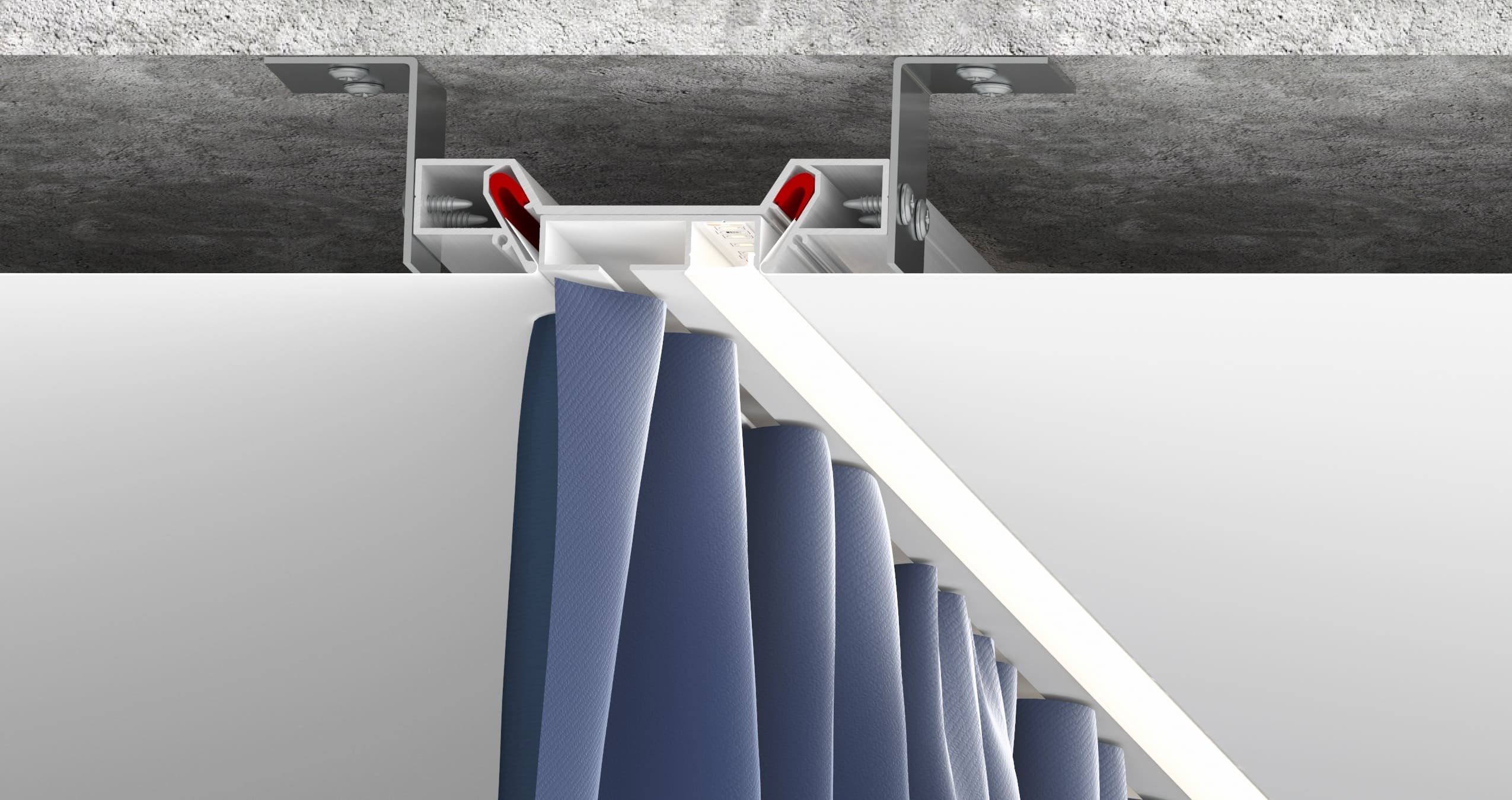 Вкладыш VMK01 представляет собой гардину белого или черного цвета с одним рядом для крючков и местом для установки подсветки. Он устанавливается в профиль MK01 и закрывает пазы для крепления гарпуна.