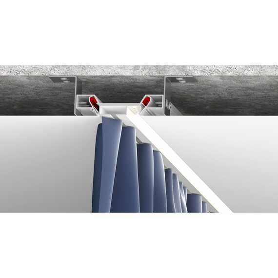 Мини карниз – это двухсоставной алюминиевый карниз. Одна часть выполнена в виде держателя MK01, который крепится на потолок, вторая часть - в виде специального вкладыша VMK01.