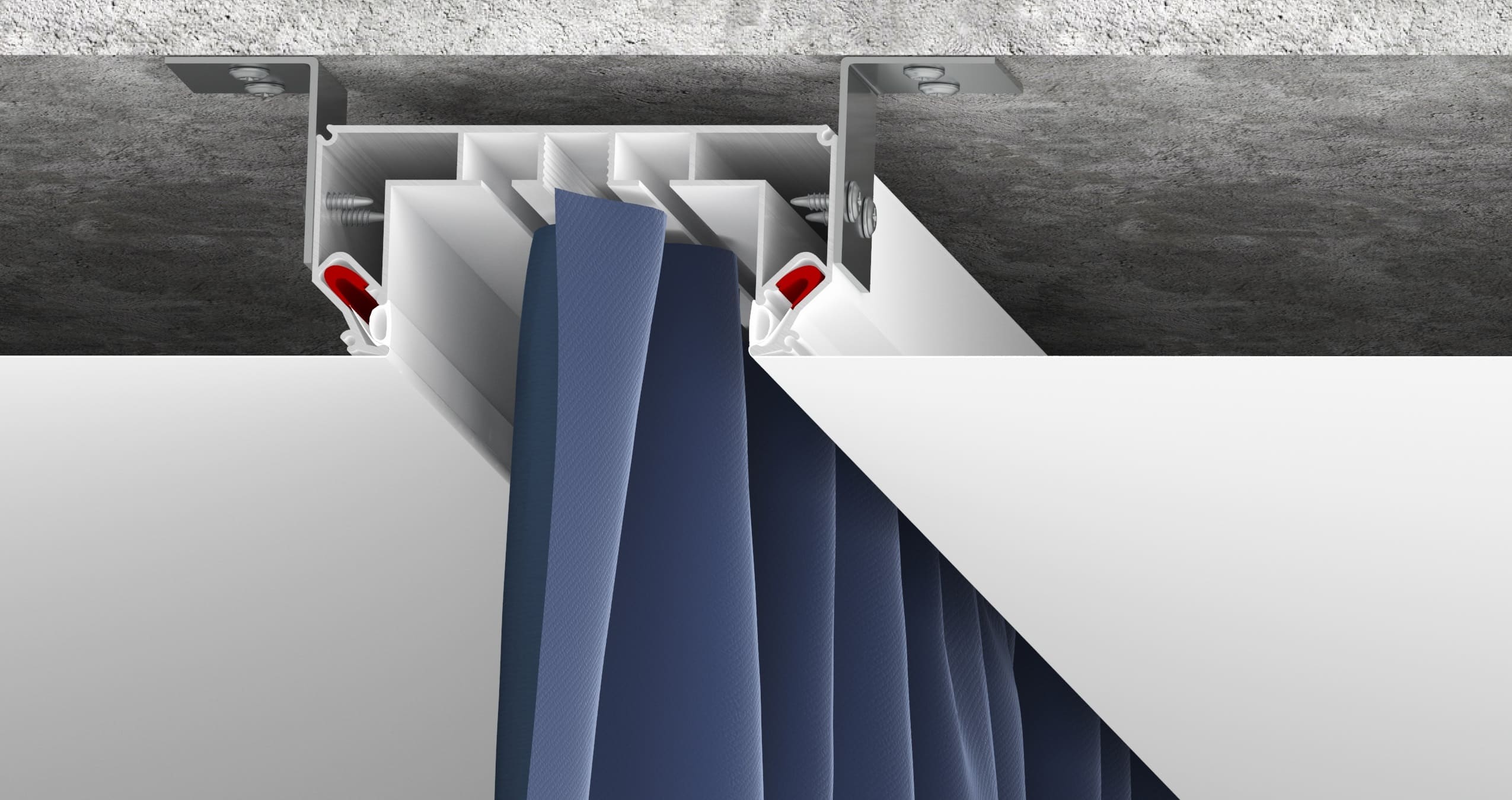 Универсальный карниз – разновидность дизайнерского карниза. Он представляет собой цельнометаллический профиль белого или черного цвета с двумя рядами для крепления крючков и местом для установки подсветки. Карниз имеет оптимальную ширину для того, чтобы складки на шторах формировались правильно. Возможна установка светодиодной ленты для подсветки штор, которая направлена вертикально вниз и закрывается рассеивателем. Конструкция профиля предусматривает фиксацию полотна при помощи гарпунной системы крепления. Вертикальный паз для заправки гарпуна закрывается разделительной вставкой (R).