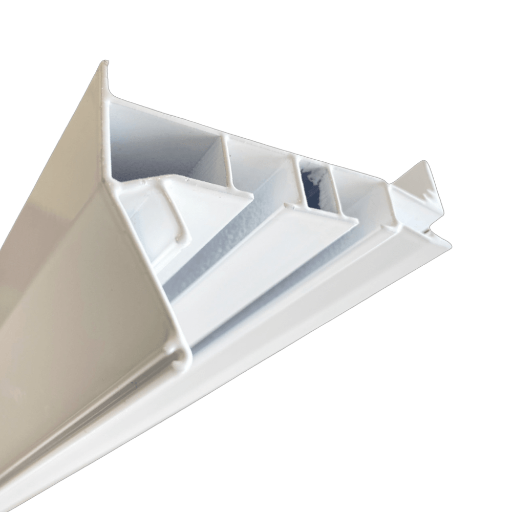 Профиль ПК-15 карниз предназначен для скрытого крепления штор и изготовления ниш под карниз потолочного крепления. Отличается от ПК-5 тем, что имеет два ряда креплений штор. Профиль стыкуется со стандартным стеновым багетом, а также с системами контурного потолка. В процессе монтажа крепится на металлические уголки к основному потолку.