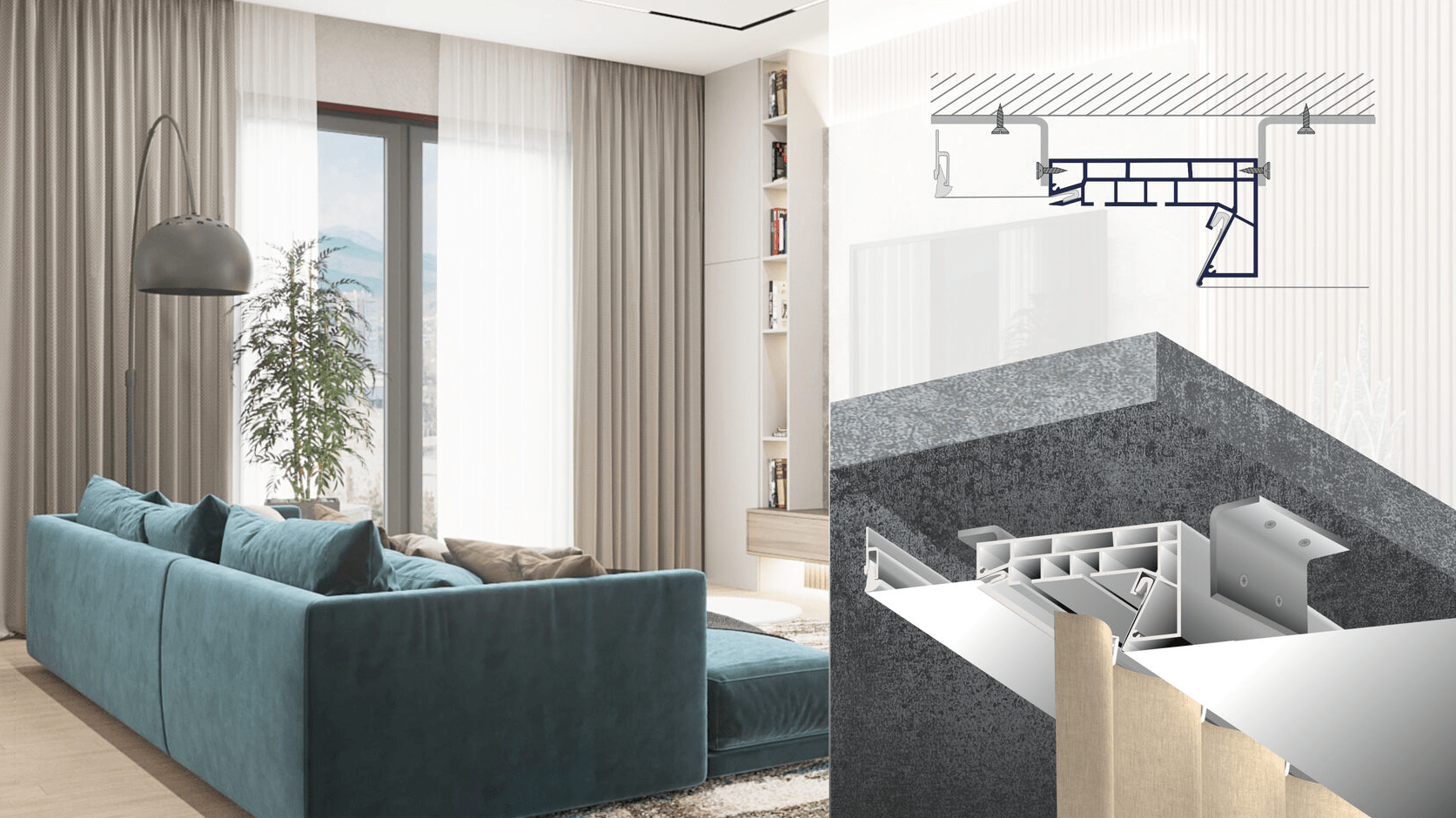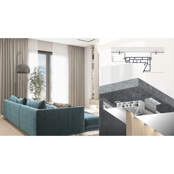 Для скрытого крепления штор и создания ниши под карниз.