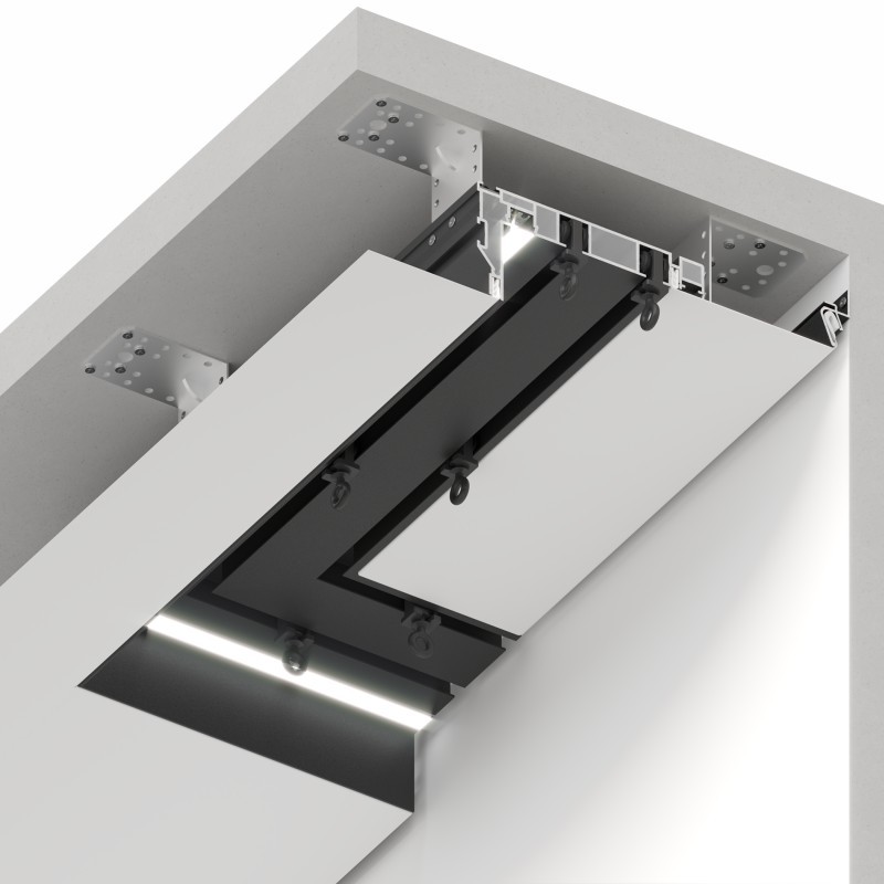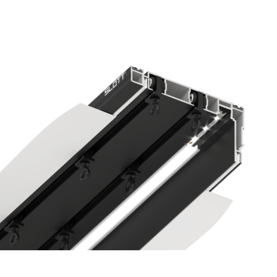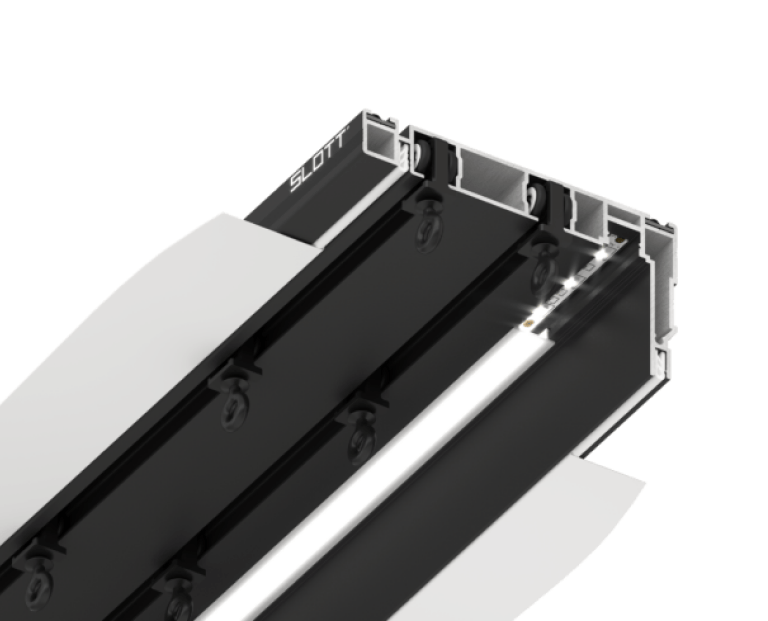 Новая система гардинного профиля разработана для механического карниза с двумя рядами. Первый ряд предназначен для штор, второй для тюля. Профиль выполнен из цельного алюминия. Карнизная система образует нишу благодаря специально разработанному выступающему краю. Таким образом, бегунки скрыты от глаз, видимой частью остается только сама штора.