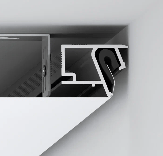 Главное назначение теневого профиля — создание ровного, эстетичного разрыва плоскости потолка и стены. Такое техническое решение создает визуальный эффект потолка, не прикрепленного к стене, и скрывает все мелкие неровности. Особенно актуален этот прием при наличии рельефной поверхности стены.