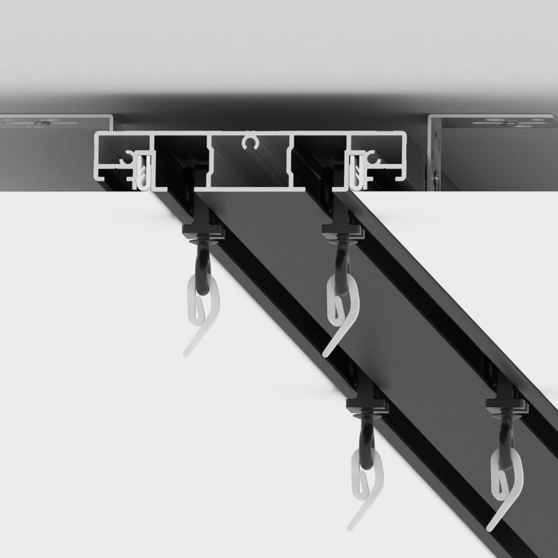 Важная особенность решения – наличие бесшумных прорезиненных бегунков белого или черного цвета. Система комплектуется демпфером для монтажа ПВХ и тканевых полотен.