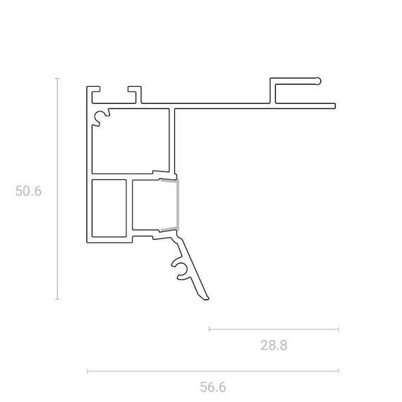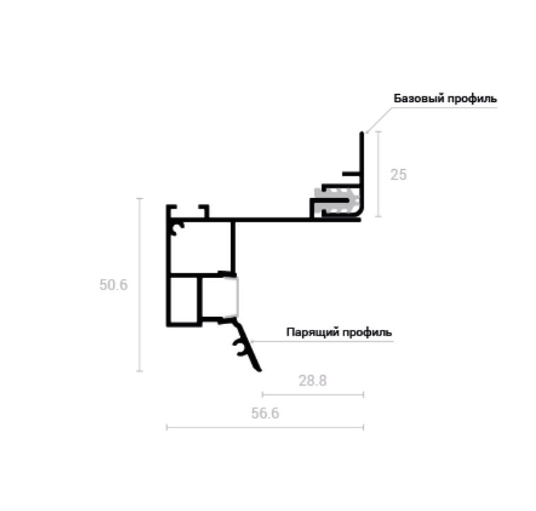 Двусоставной потолочный профиль, монтируемый с каркасом потолка для обеспечения декоративного зазора в 30 мм. Связь со стеной обеспечивается с помощью базового профиля UMBRA через подвижный полимерный элемент.