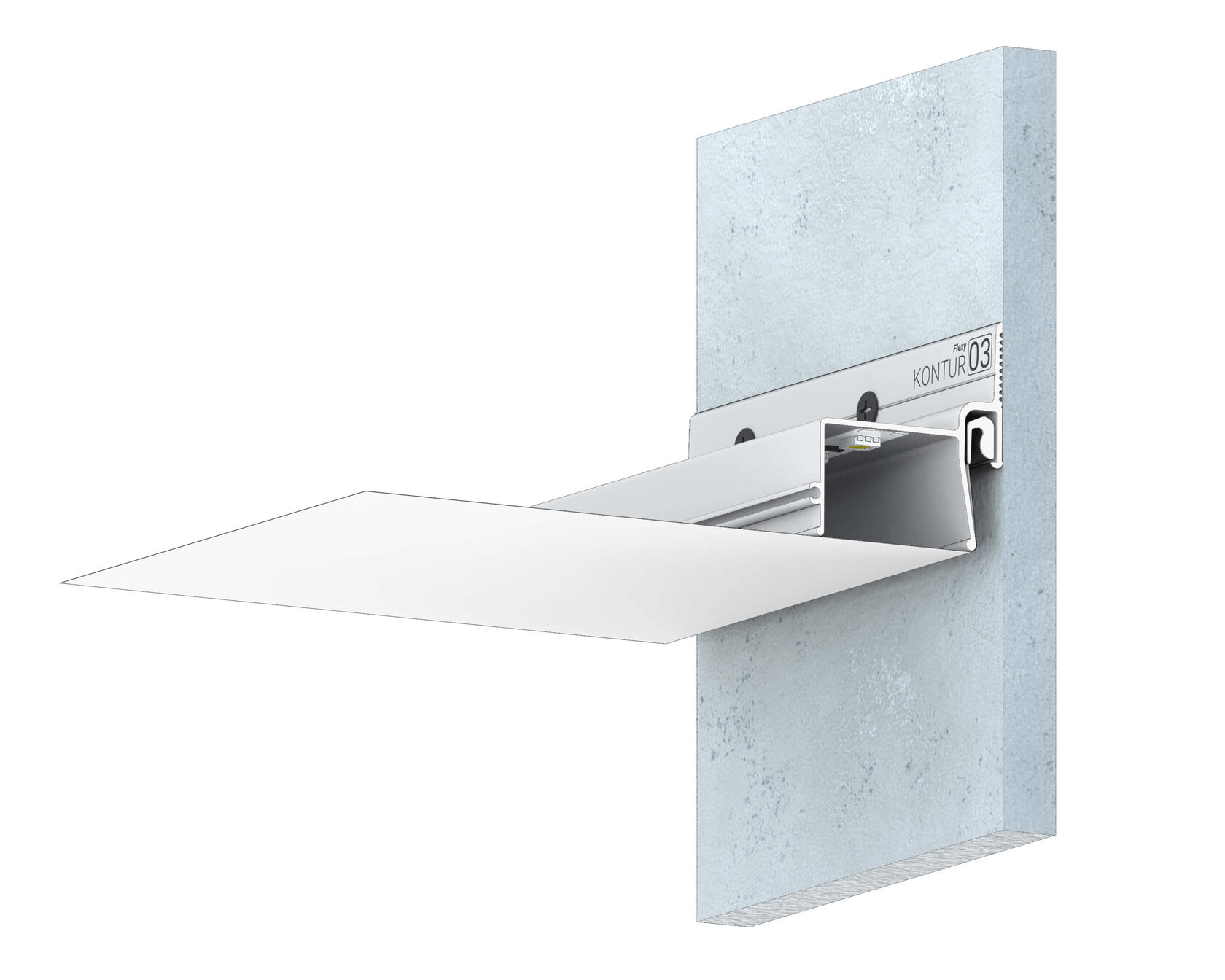 Стеновой контурный профиль Flexy KONTUR 03 для натяжных потолков с гарпунной системой крепления полотна. С полкой для светодиодной ленты для подсветки через полотно, направленной вниз. С теневым зазором.