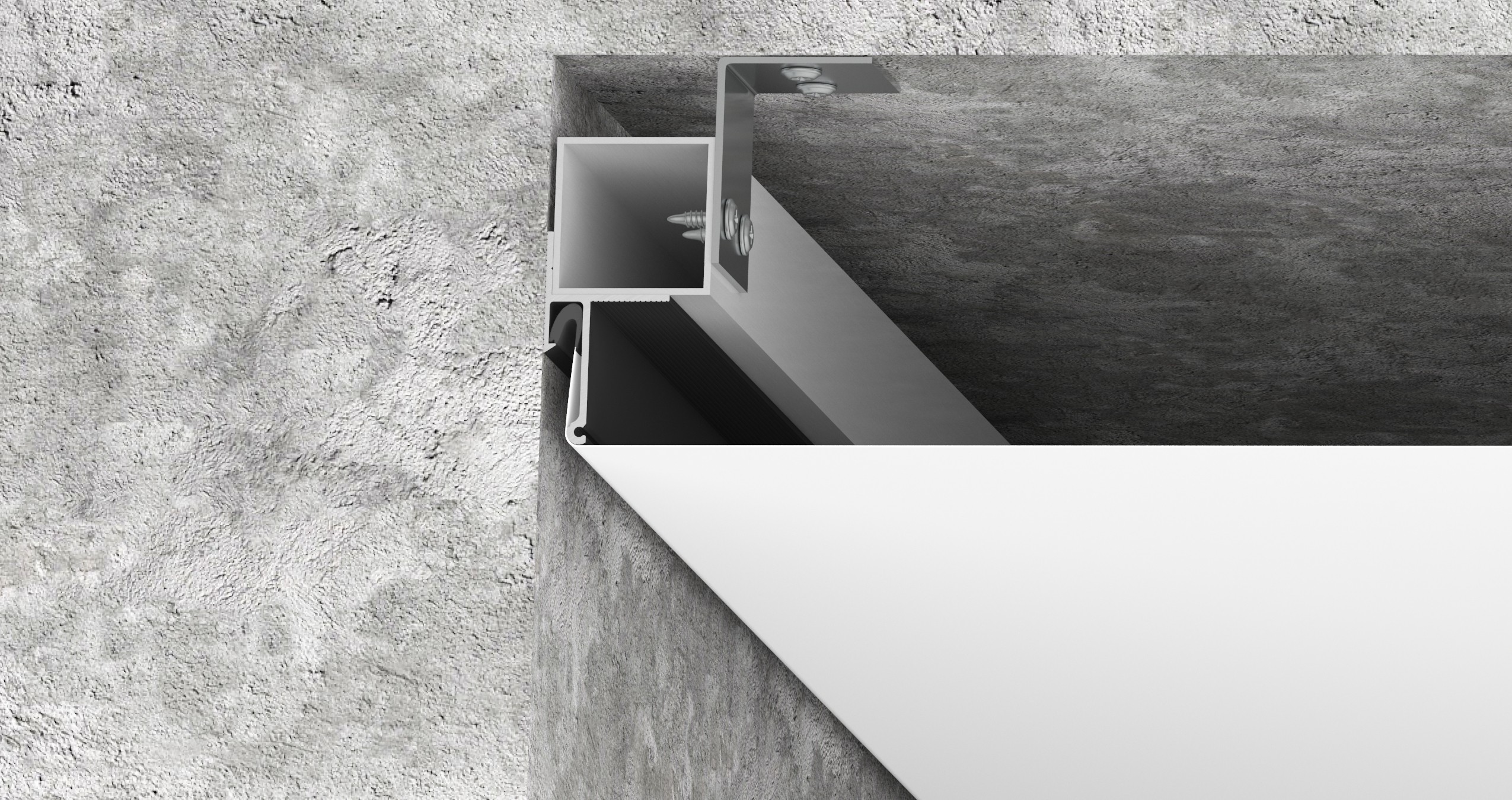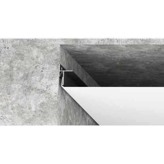 Контурный потолок: Визуальная особенность этой конструкции заключается в образовании теневой зоны по периметру помещения шириной 0,6 см. Таким образом профиль обеспечивает идеально ровный темный контур без установки заглушки по периметру потолка. Уникальная особенность профиля в том, что его можно крепить к стене, а также при помощи алюминиевого бруса к потолку.