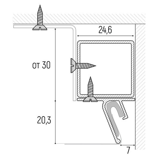 Профиль EuroKRAAB Потолочный это дизайнерское решение для сочетания плоскости потолка со стеной, при котором оставляется правильный, ровный теневой зазор. Благодаря такому методу на стене остаётся правильный, ровный теневой зазор, создаётся ощущение, словно потолок парит в воздухе, совершенно не касаясь стен. Благодаря теневому зазору финишная отделка стен (поклейка обоев, покраска и др.) может выполняться уже после установки натяжного потолка. Это существенно упрощает и облегчает алгоритм последовательности при отделке, и позволяет снизить риски порчи стен. Кроме того, в дальнейшем, освежать отделку на стенах существенно проще благодаря именно такому зазору.