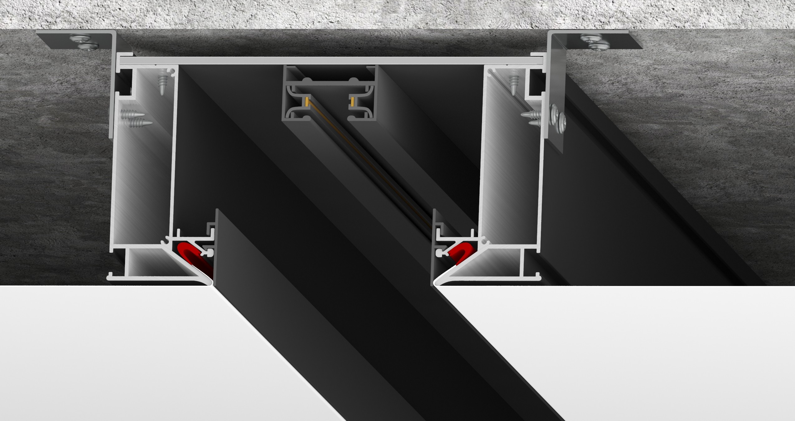 5. Скрытый трек: Шинопровод Track 30 LumFer устанавливается в нишу и крепится к композитному материалу. Таким образом шинопровод и крепление светильника максимально скрыты. Ниша бывает черного и белого цвета. В специальные пазы с двух сторон профиля устанавливается светодиодная лента. Конструкция профиля предусматривает фиксацию полотна при помощи гарпунной системы крепления. Паз для фиксации гарпуна закрывается маскирующей вставкой ПВХ черного или белого цвета.