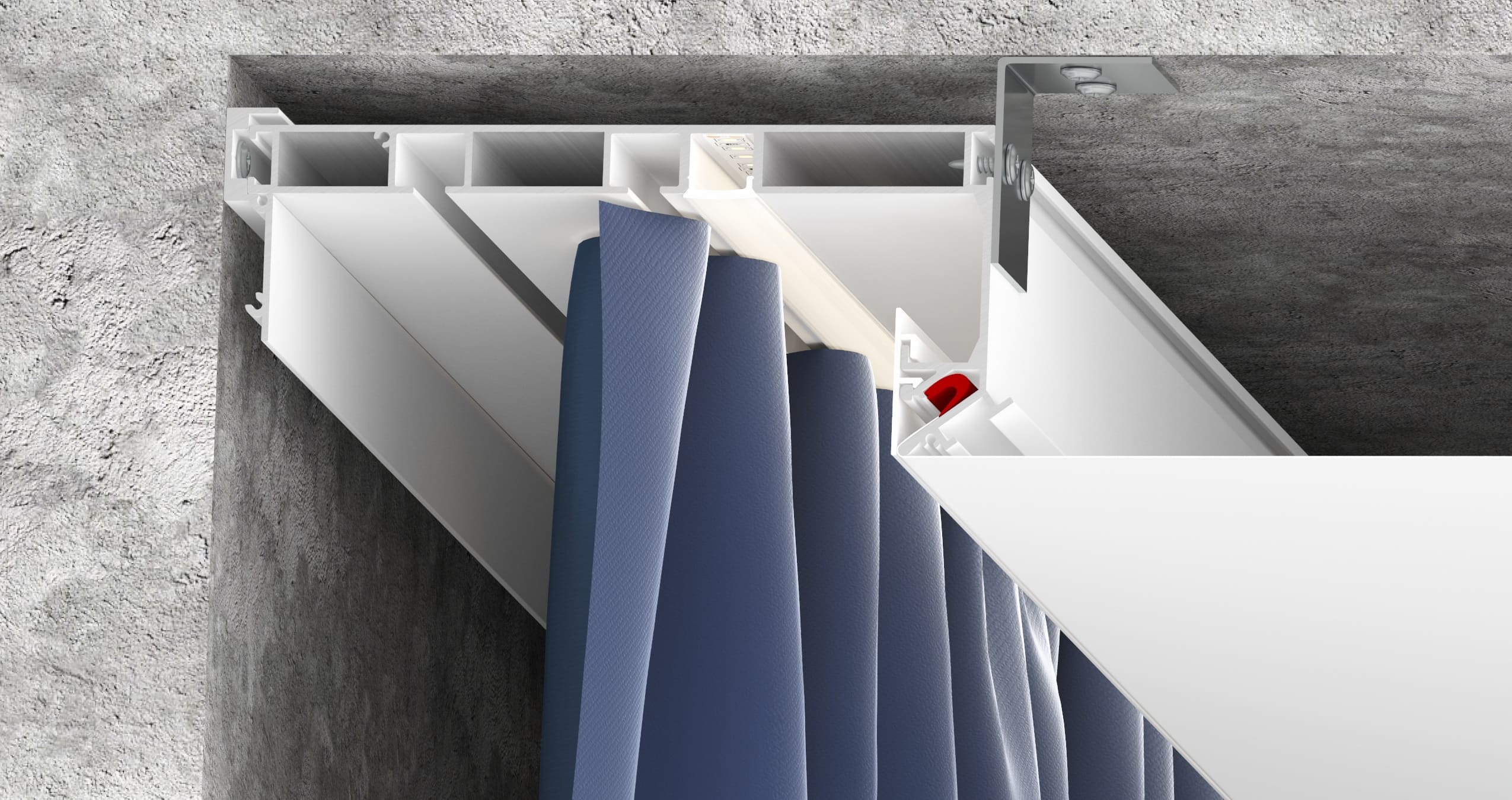 Скрытый карниз 03: Разновидность дизайнерского карниза, который устанавливается вплотную к стене. Он представляет собой цельнометаллический профиль белого или черного цвета с двумя рядами для крепления крючков. Карниз имеет оптимальную ширину для того, чтобы складки на шторах формировались правильно. Возможна установка светодиодной ленты для подсветки штор, которая направлена вертикально вниз и закрывается рассеивателем. Конструкция профиля предусматривает фиксацию полотна при помощи гарпунной системы крепления. Вертикальный паз для фиксации гарпуна закрывается маскирующей вставкой, алюминиевой или ПВХ.