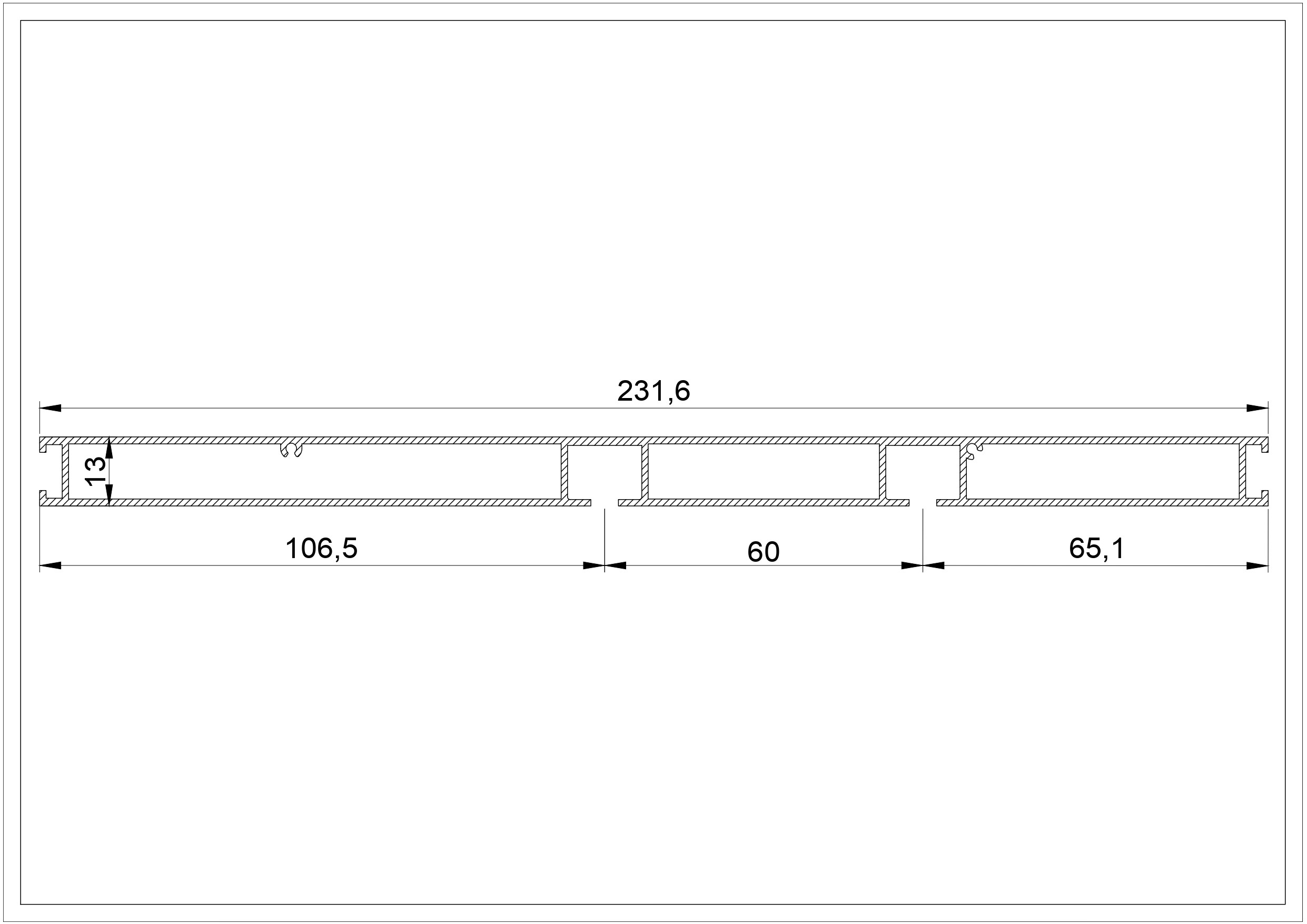 Представляет собой алюминиевый профиль белого или черного цвета с двумя рядами для крепления крючков с одной стороны и имеет (ровную, плоскую) цельную поверхность с другой стороны, высота профиля составляет 13 мм, ширина 231,6 мм, расстояние между дорожками 60 мм.