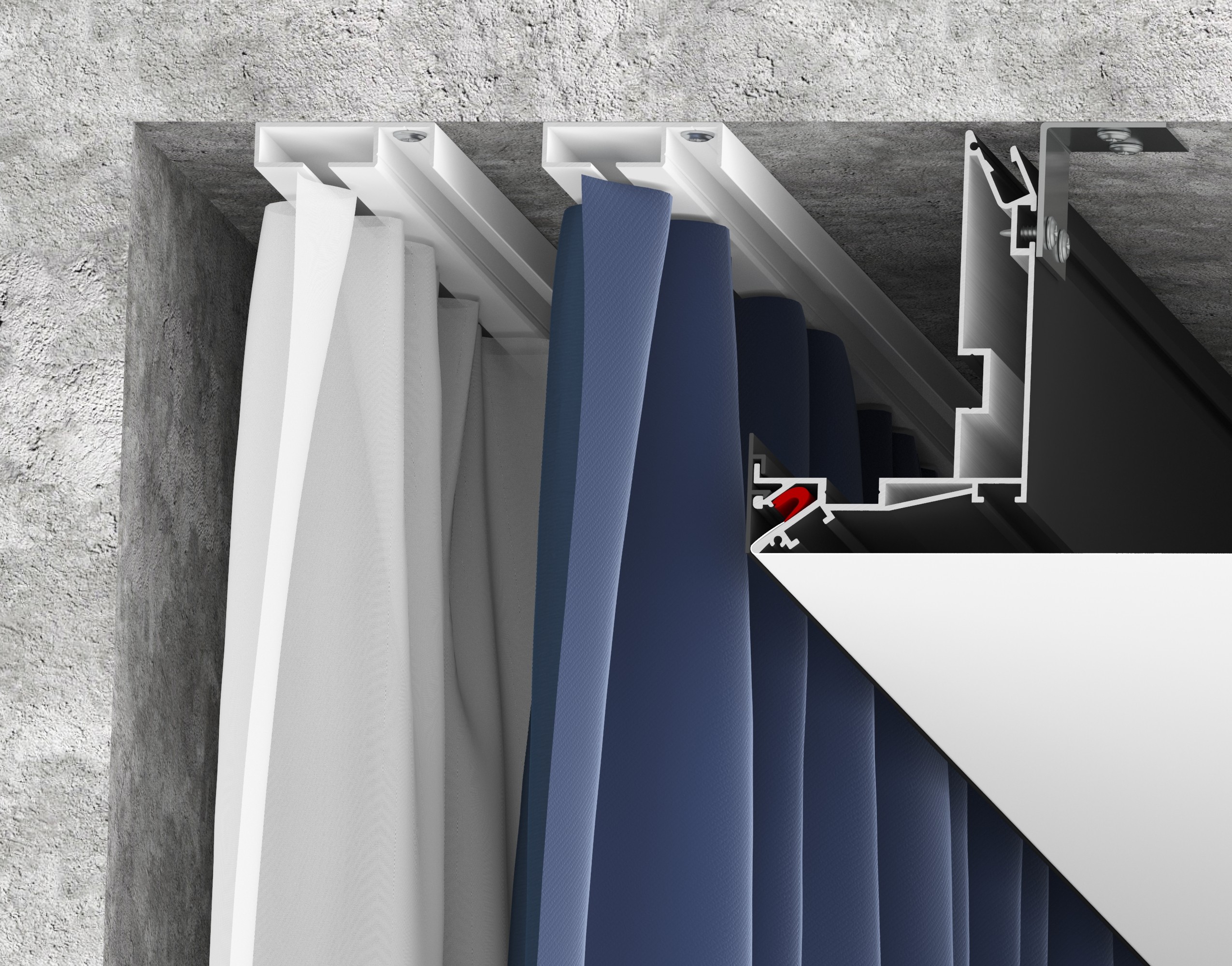 2. Универсальная ниша для карниза – при помощи профиля UN изготавливается ниша для карниза любой ширины, в которую есть возможность установить профили VMK01 и VMK02 (вкладыши мини карнизов), с необходимыми отступами от полотна и расстоянием друг от друга. Профили VMK01 и VMK02 можно крепить к базовому потолку, так и в карнизы MK01 и МK02. В нишу можно установить карнизы, роль шторы, жалюзи. Ниша может изготавливаться различной формы вдоль одной и вдоль нескольких стен. Стыкуется с профилем, расположенным по периметру помещения: стеновым багетом, теневым EuroLumFer. Конструкция профиля предусматривает фиксацию полотна при помощи гарпунной системы крепления. Паз для фиксации гарпуна закрывается алюминиевой или ПВХ вставкой