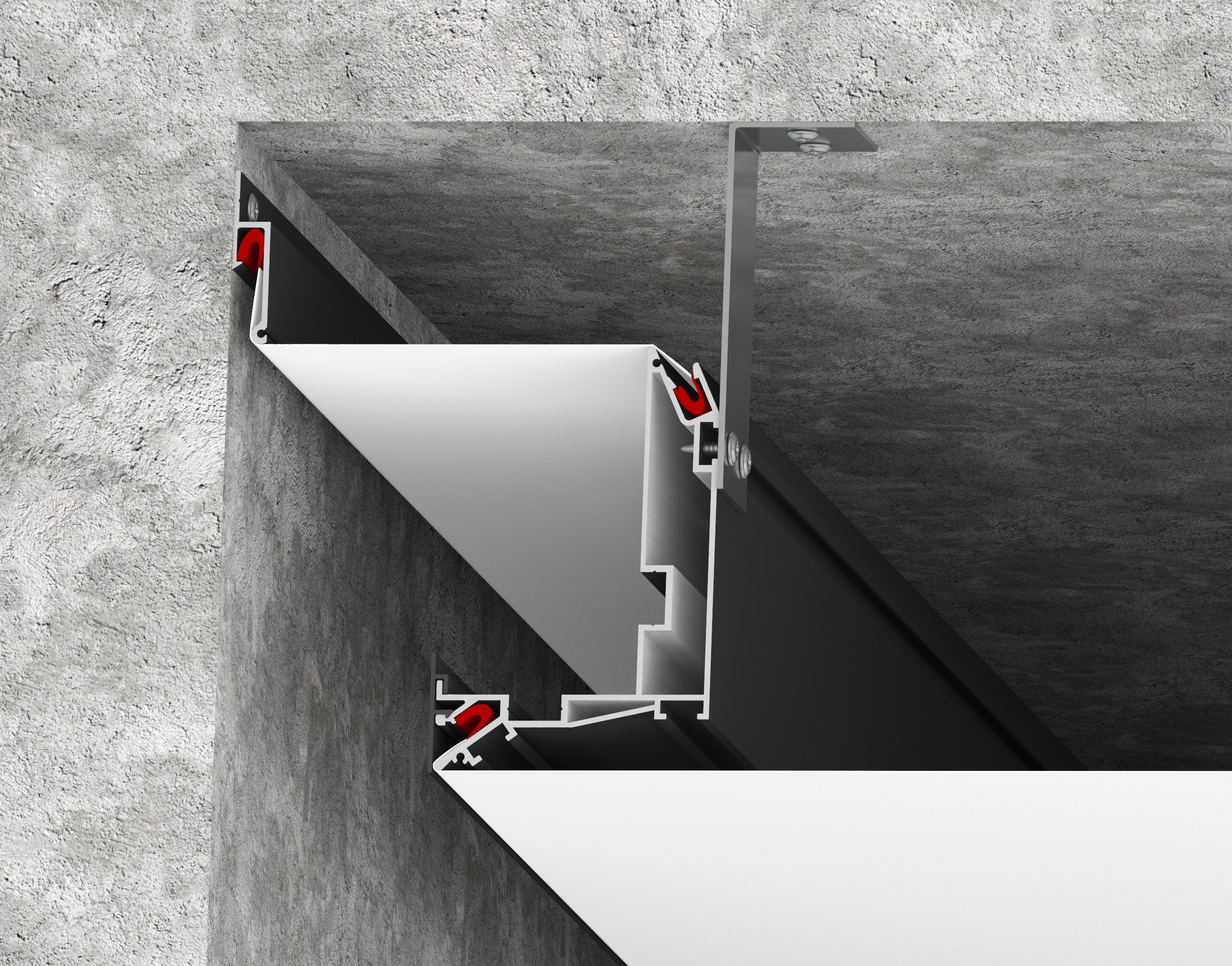 При помощи профиля LumFer UN можно реализовывать нишу любого размера по периметру помещения как с подсветкой, так и без. Для данного вида конструкции рекомендуется использовать полотна LumFer для предотвращения засветок за полотно. Профиль крепится к потолку при помощи анкерных уголков.