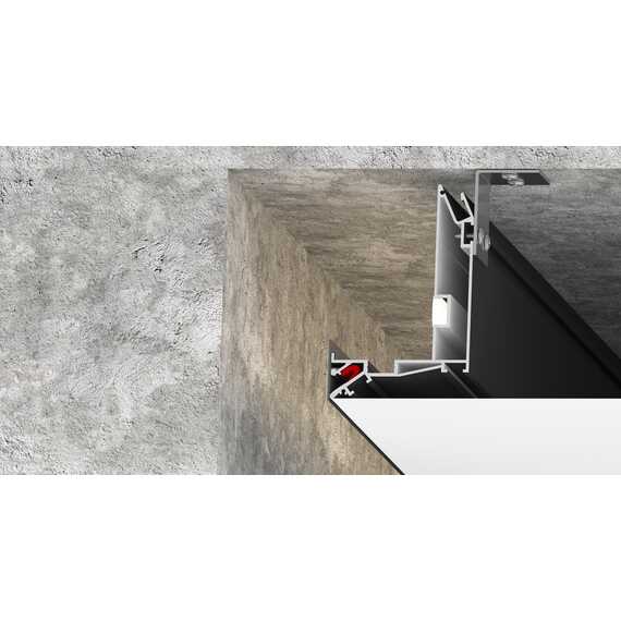 При помощи профиля LumFer UN можно реализовывать переход уровня в помещении как с подсветкой, так и без нее. Для данного вида конструкции рекомендуется использовать полотна LumFer для предотвращения засветок за полотно. Профиль крепится к потолку при помощи анкерных уголков.