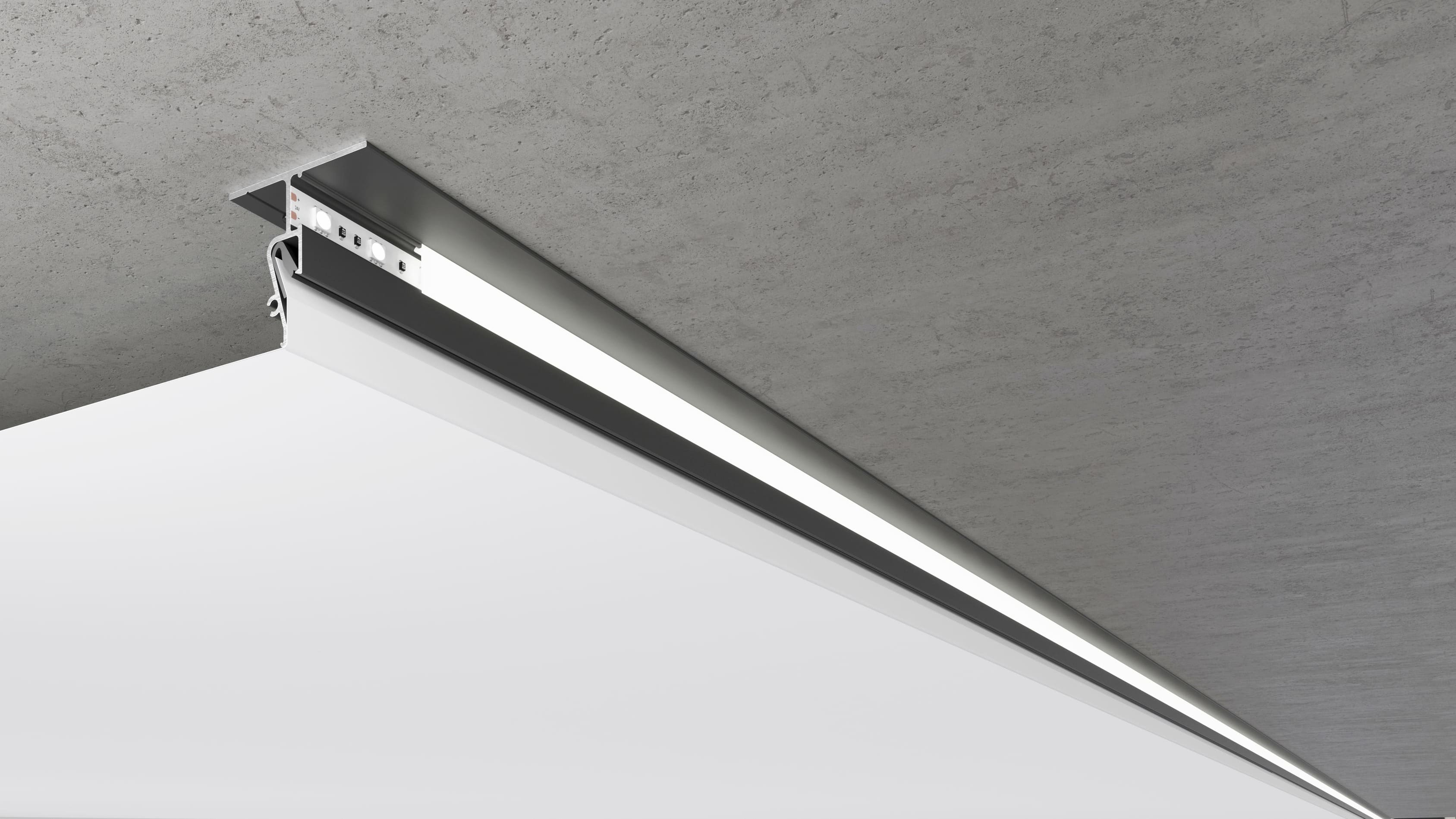 Потолочный профиль Contour-Pro для парящей подсветки вдоль стен c использованием светодиодной ленты и светорассеивающей вставки.