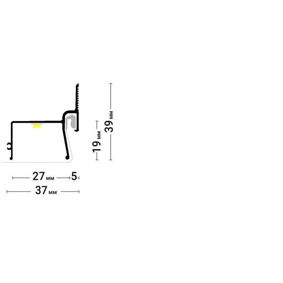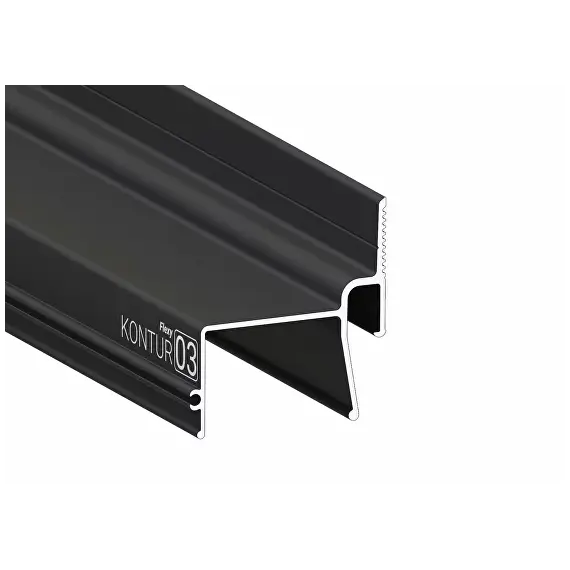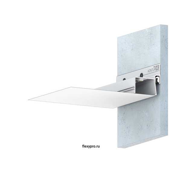 Стеновой контурный профиль Flexy KONTUR 03 для натяжных потолков с гарпунной системой крепления полотна. С полкой для светодиодной ленты для подсветки через полотно, направленной вниз. С теневым зазором.