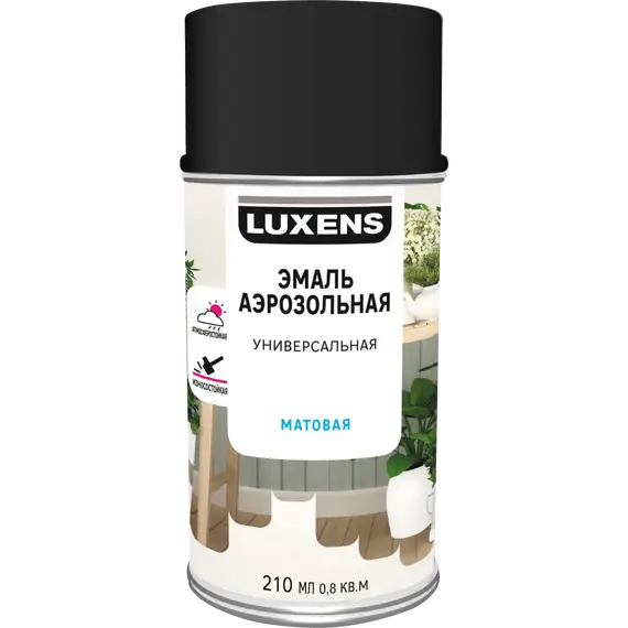 Аэрозольная эмаль Luxens универсальная идеально подходит для окрашивания и обновления любых поверхностей. Благодаря особому составу ее можно наносить прямо на ржавчину, она устойчива к ударам, царапинам и пожелтению, выдерживает температуру до 80 °C. После нанесения поверхность легко очищается, ее можно мыть. Объем баллона — 210 мл. Эмаль неподтекающая, время высыхания между двумя слоями — 15 минут, полностью высыхает за сутки. Цвет — черный, матовый.