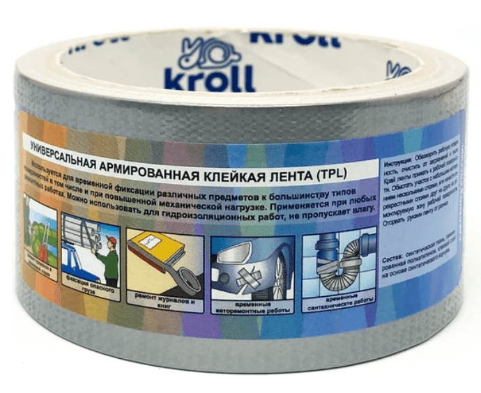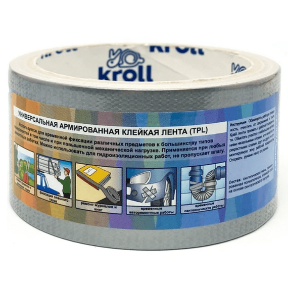 Технические характеристики ленты Kroll включают максимальную температуру эксплуатации до +60 °С и минимальную температуру до -15 °С, что делает её пригодной для использования в широком диапазоне климатических условий. Армированные волокна обеспечивают дополнительную прочность и устойчивость к растяжению, а синтетический каучуковый клеевой слой гарантирует надёжное сцепление с поверхностью.