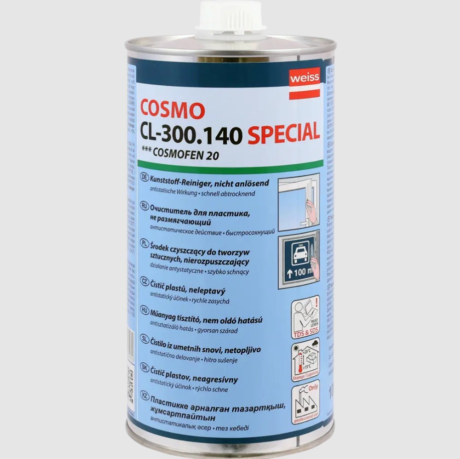 Очиститель нерастворимый Cosmofen 20 применяется в качестве не растворяющего чистящего средства для изделий из ПВХ. Очищает окна ПВХ от пыли, защитной пленки, монтажной пены, герметика (включая окна, покрытые декоративной пленкой). Очищает пластиковые поверхности от следов резины, смолы, битума. Содержит антистатик (предотвращает быстрое повторное загрязнение поверхностей).