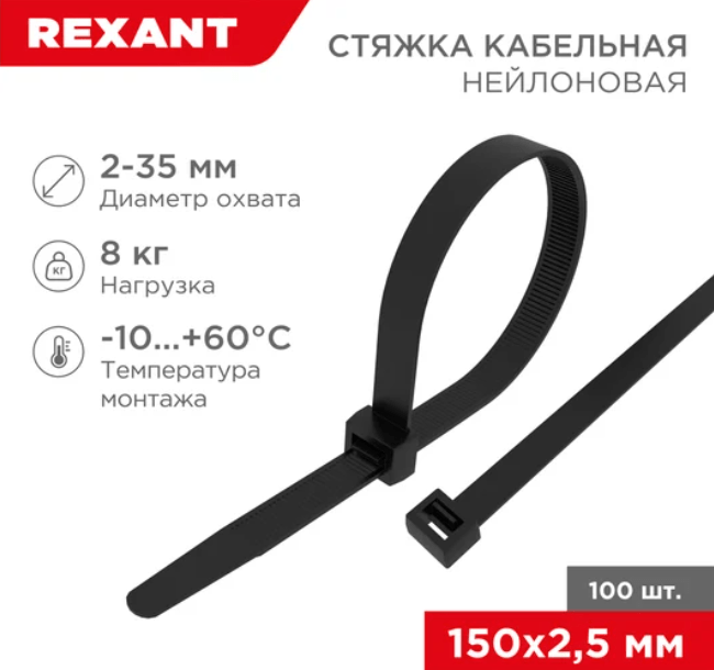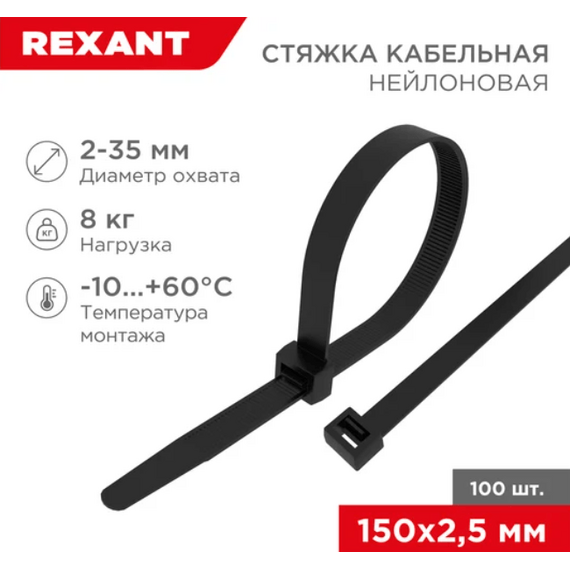 Хомут-стяжка нейлоновый 2,5х150 черные REXANT