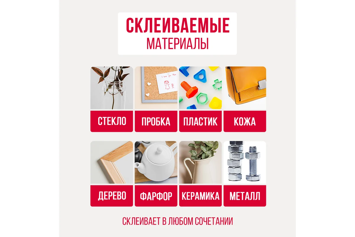 СКЛЕИВАЕТ В ЛЮБОМ СОЧЕТАНИИ • дерево • пробка • пластик • кожа • резина • фарфор • керамика • металл