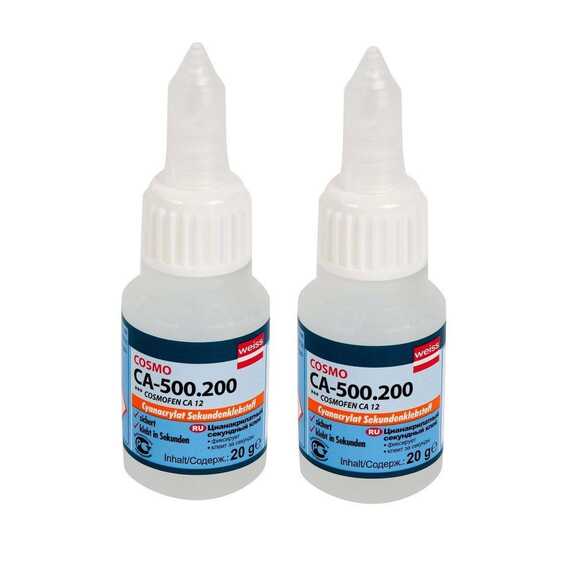 Цианоакрилатный клей Cosmofen CA 500.210 фирмы «Weiss» Производство Германия Это однокомпонентный быстросохнущий цианоакрилатный клей, основанный на этиле. Он характеризуется быстрым действием, приклеивание занимает всего несколько секунд. Цианоакрилатный клей Cosmofen CA 500.210 имеет многостороннее применение. Рекомендуется его применение при трудно склеиваемых предметах. Цианоакрилатный клей Cosmofen CA 500.210 наносится на одну поверхность, затем прижимается к другой до момента склеивания. Для ещё более быстрого приклеивания рекомендуется использовать активатор.