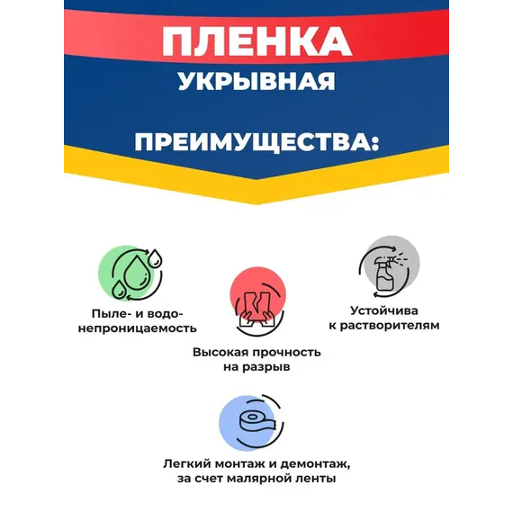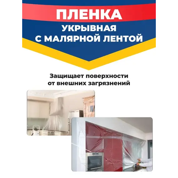 Укрывная плёнка применяется для защиты различных поверхностей от загрязнений при ремонте. Плёнка обладает отличной прочностью и пыле- и водонепроницаемостью, она так же крайне устойчива к растворителям и другим "агрессивным" жидкостям и веществам, что в совокупности со всеми другими свойствами обеспечит надёжную сохранность вашей мебели и других ответственных поверхностей. Клейкая малярная лента поможет безопасно и надёжно закрепить плёнку почти на любой поверхности для более удобной работы.