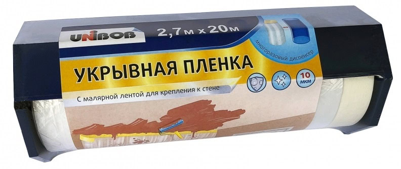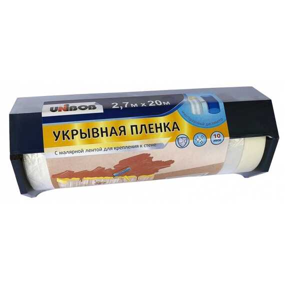 Пленка укрывная с малярной лентой Unibob 2.7*20. 10мкн + диспенсер прозрачная