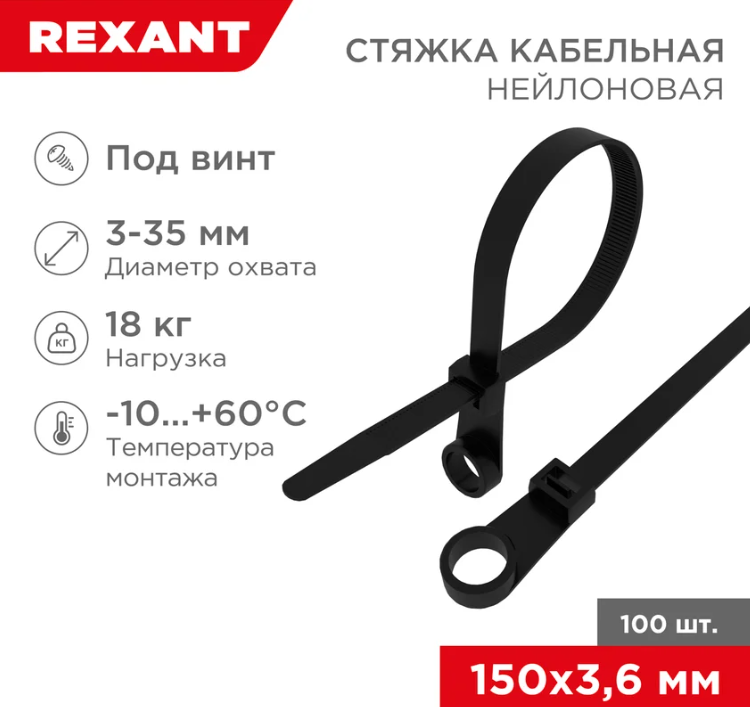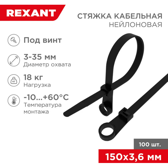 Стяжка(хомут) 150х3,6мм нейлоновая черная под винт 100шт REXANT