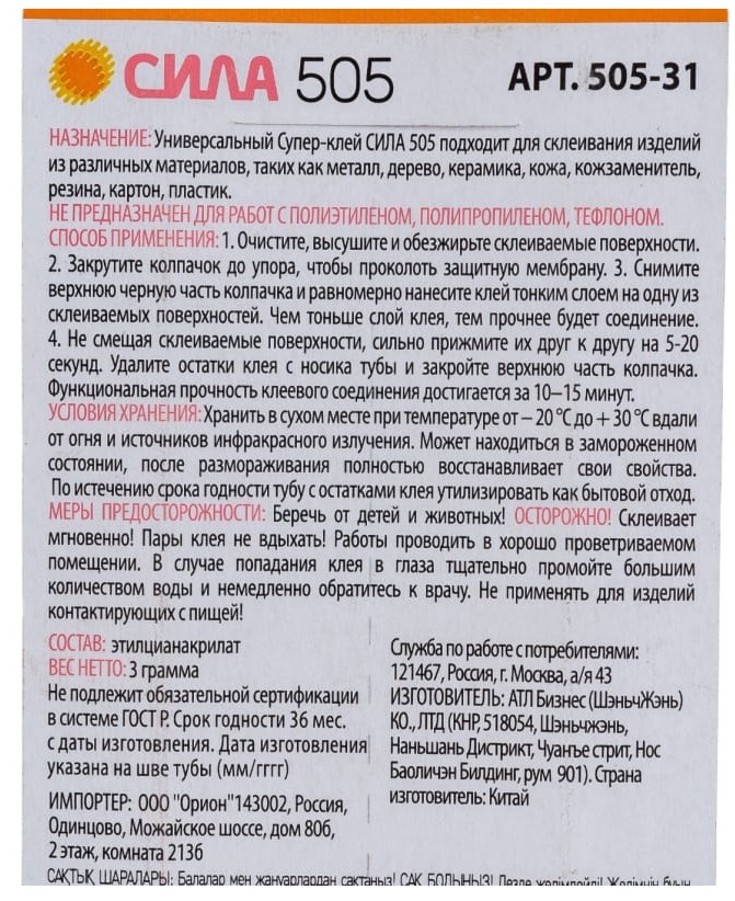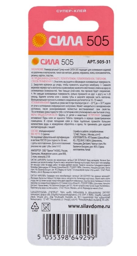 Супер Клей СИЛА 505 3г. Блистер, инд.упаковка