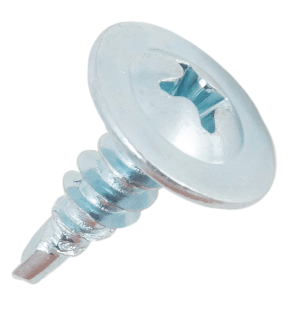 Саморез с прессшайбой и сверловидным наконечником, шляпка самореза выполнена в виде полукруглой головки на которую напрессована плоская шайба.