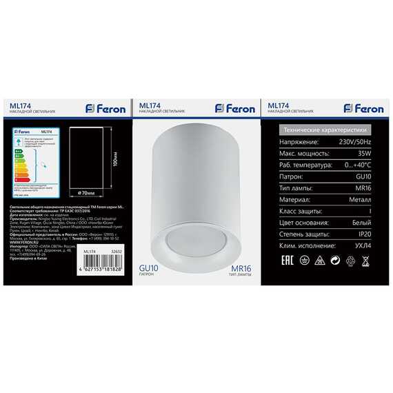 Светильник накладной под лампу, спот неповоротный FERON ML174, GU10 35W, 230V, IP20, цвет белый, корпус металл, 70*70*100