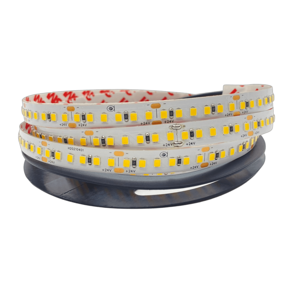 LED лента теплого белого цвета свечения имеет белую подложку. На одной стороне ленты находится двухсторонний скотч, благодаря которому её легко прикрепить к чистой, предварительно обезжиренной поверхности.