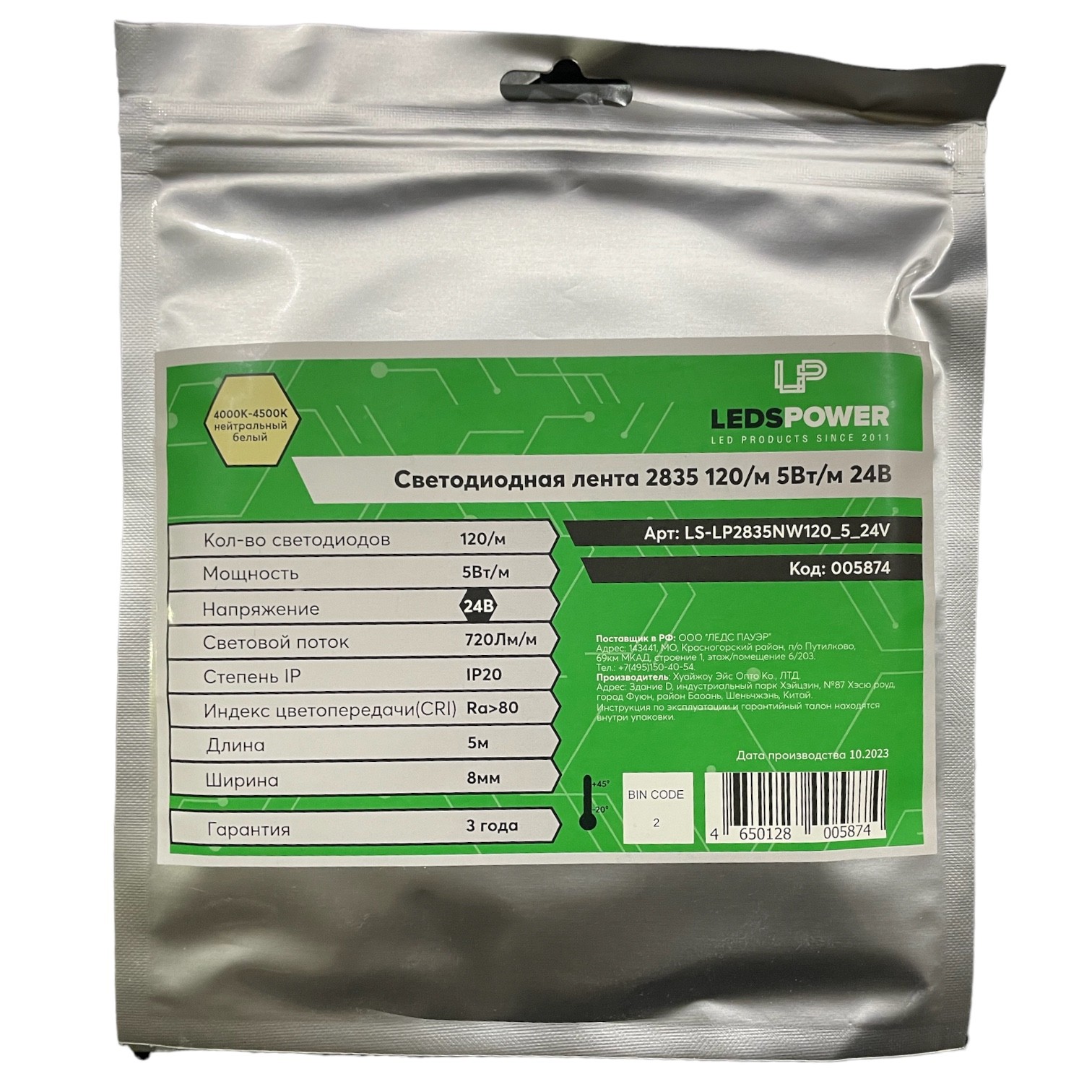 6031 Светодиодная лента LEDS POWER 2835 5Вт/м, 24В, 120д/м, нейтральная