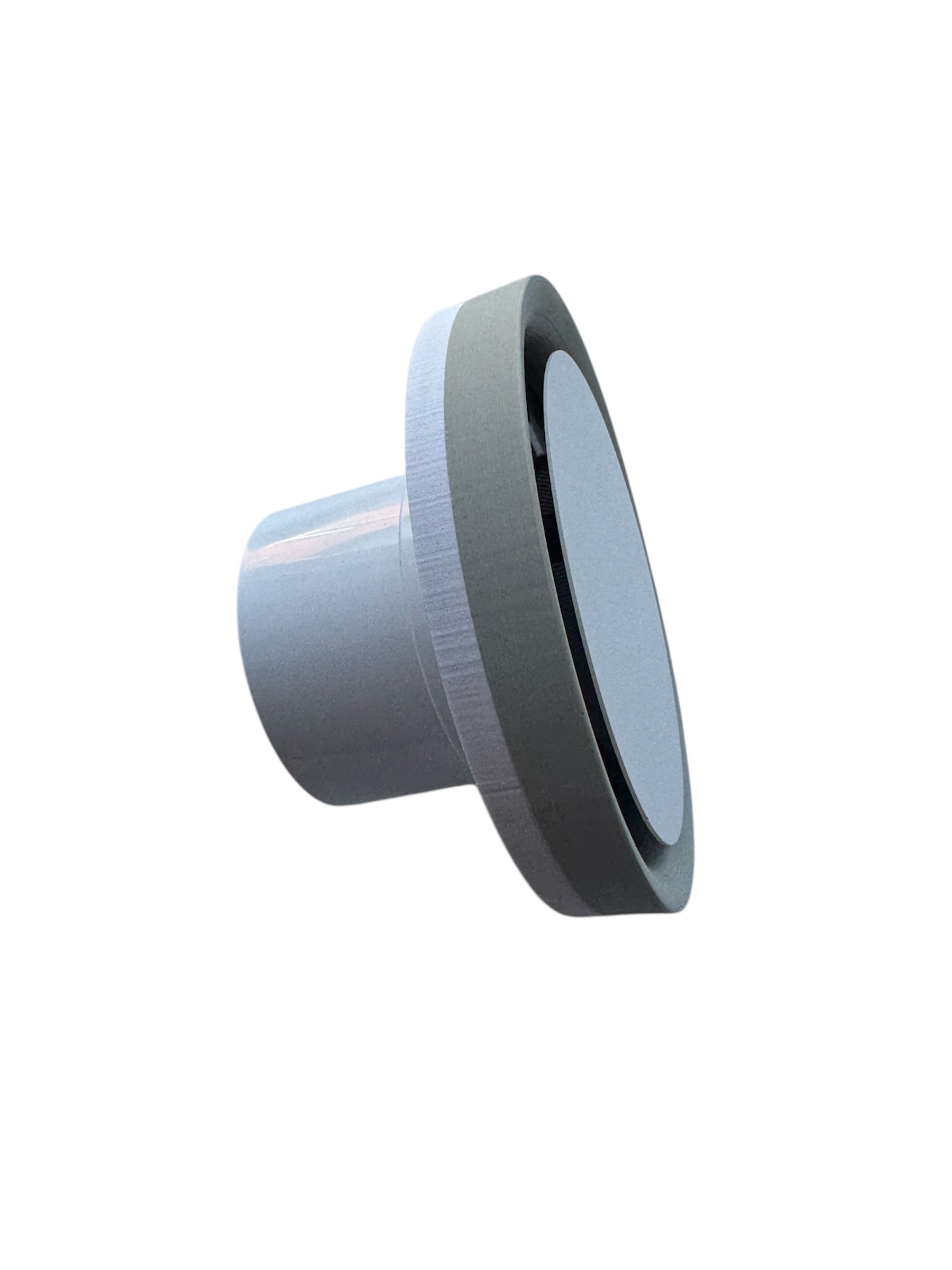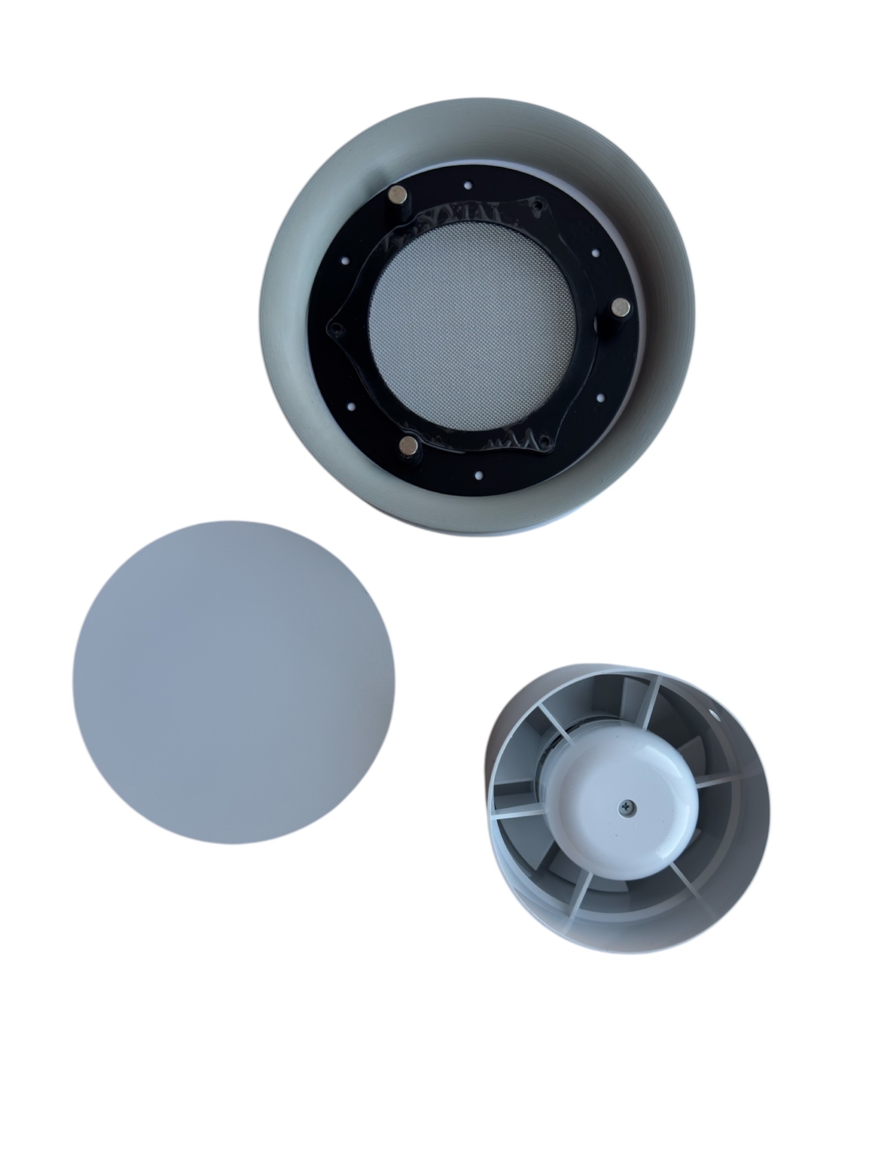 Металлопластиковое основание с закруглением в стиле теневого профиля RAUND, крепление на магниты, страховочное кольцо с сеткой. Возможность замены вентилятора без демонтажа полотна. Диск устанавливается вровень с полотном. Декоративное кольцо в оттенке белый мат, радиус 150мм. Вентилятор на подшипниках, высота 80мм. Общий габарит по высоте 97мм.
