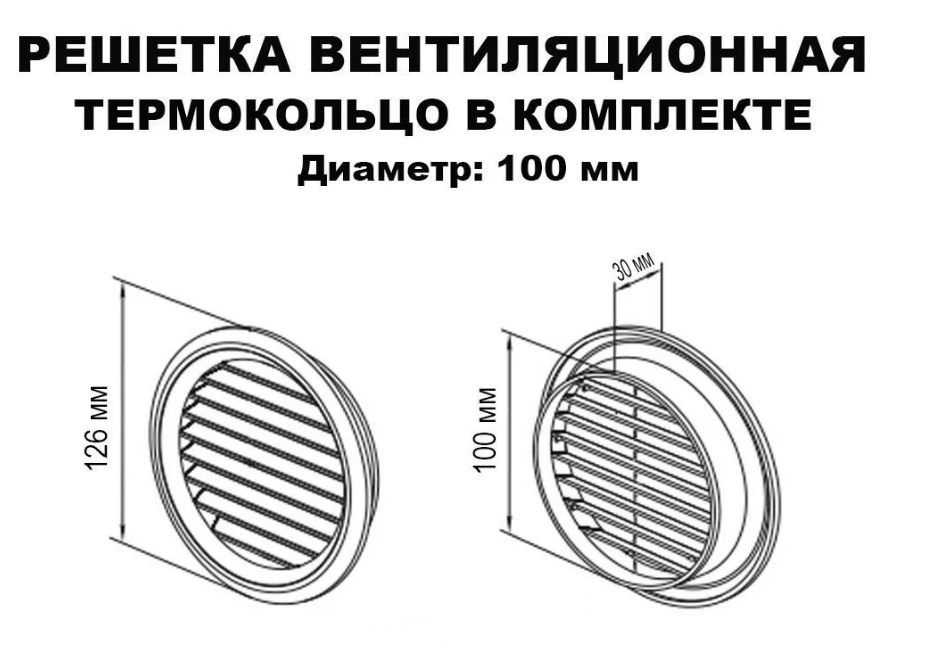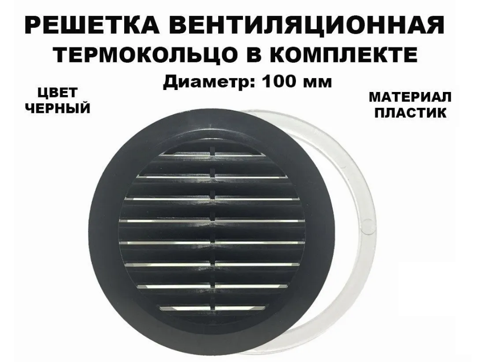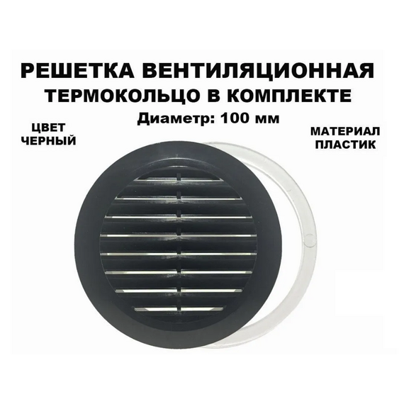 Вентиляционная решётка размером 100 мм с кольцом чёрного цвета предназначена для равномерного распределения воздушного потока в межпотолочном пространстве и основном помещении. Она помогает избежать образования конденсата в комнатах с повышенной влажностью. Решётка изготовлена из АБС-пластика и имеет внутренний диаметр 100 мм.