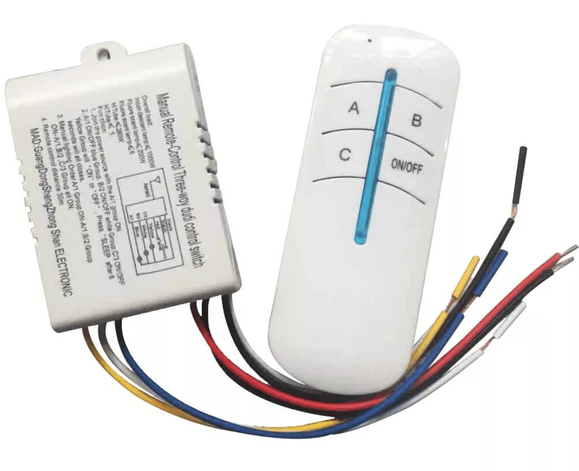Для управления устройством в комплекте идет радиочастотный пульт дистанционного управления с четырьмя кнопками. Питание пульта осуществляется от элемента питания типоразмера L1028 23A 12v (есть в комплекте). Пульт оснащен четырьмя кнопками: A, B, С, ON/OFF. При нажатии на кнопку A будет включаться канал A. При повторном нажатии на кнопку канал A отключится. При нажатии на кнопку B будет включаться канал B. При повторном нажатии кнопки B, канал B отключится. При нажатии на кнопку С будет включаться канал С. При повторном нажатии кнопки С, канал С отключится. При нажатии кнопки ON/OFF включаться и выключаться оба канала.