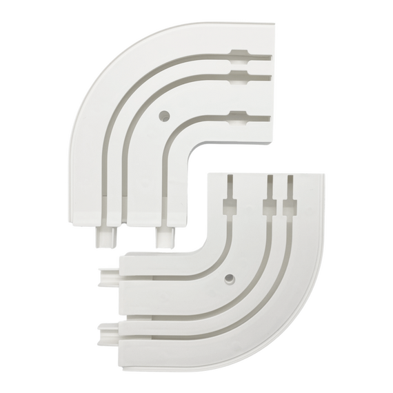 Соединитель поворотный трехрядный является готовым решением для карнизов с пластиковой шиной. Это поворотный элемент, который позволяет создать пластиковую шину с круглыми боковинами или эркером. Изготовлен из белого пластика.